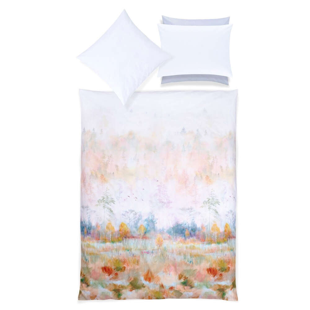 A warm, autumnal mood lies over the landscape. Colorful ochres, reds and greens illuminate the trees and grasses. Delicate wisps of mist float over the treetops, giving the print design a light appearance that fades into brilliant white. Painted in the in-house atelier, the autumnal atmosphere is printed in Northern Italy on the exclusive and well proven cotton sateen.