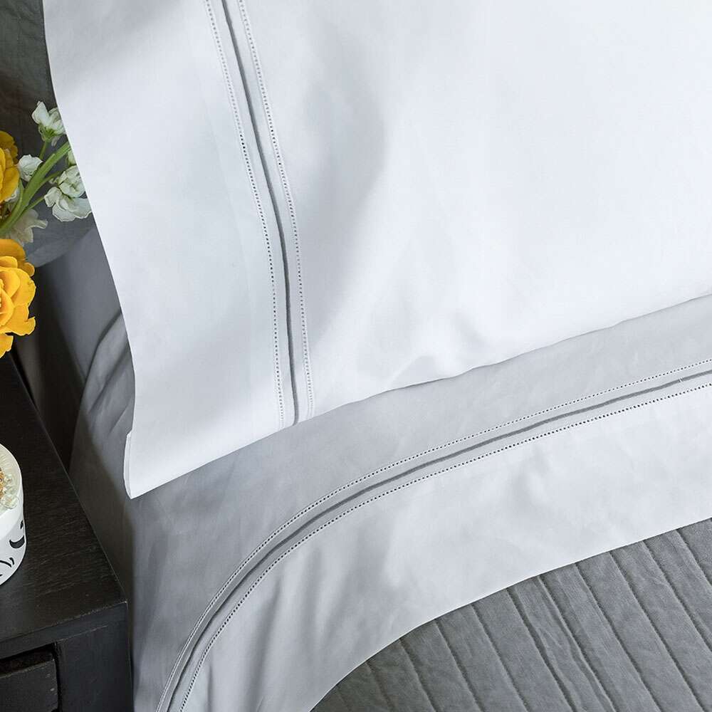 Bella White 300TC Sheet Set and Pillowcase have a double hemstitch in white cotton percale with white satin embroidery. Sheet Set includes one flat sheet, one 18" deep fitted sheet, and two pillowcases.