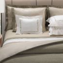 The Bolsena Collection uses an unusual, modern fabric whose distinctive element is its unique double-faced quality. This lovely fabric is 40% cotton sateen and 60% yarndyed linen, the exclusive result of a high-quality Italian production chain. With its different yarns and colors, the warp and weft play off each other, generating an intriguing fabric that presents cotton sateen on one side and linen on the other. It creates an effect that is surprising for the texture of the material yet is also soft and shiny. Linen & Cotton sateen fabric has a weft with a higher number of threads on the right side than on the reverse. This type of weaving gives an unusual shine as well as making it incredibly soft. Linen is an ancient textile fiber particularly resistant with thermoregulatory characteristics (warm in winter and cool in summer). Combined with cotton, the fabric becomes exceptionally lightweight, with a soft, delicate hand as well as easy to wash and iron. Linen is a hypoallergenic and antibacterial fabric whose cultivation is environmentally friendly as it requires very little irrigation and few pesticides.