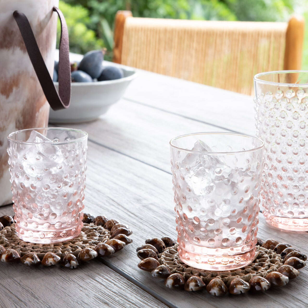 Natural cowrie is woven into the Brown pandan leaf of the Bondi coasters.