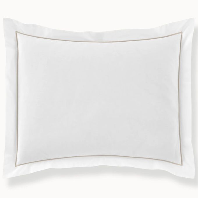Shams are constructed with a 2" flange on all 4 sides and an envelope closure on the back. Feature single row satin stitch embroidery on the hem.