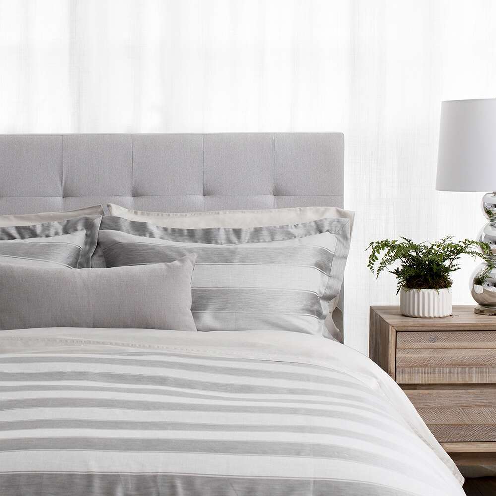 Duvet cover: Horizontal stripes. Duvet Cover Backed in Capri or Duvet Cover Pattern Overall. Knife edge. 1/8" piping in dark grey stripe. Seam zipper. King/Super King - Vertical stripes.