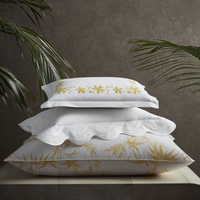 Adorned with a dancing frame of floral vines, Callista is our first decorative embroidery on the silky 500 thread count Bergamo Giza Egyptian cotton percale. Callista adds a pop of character to any room and pairs particularly beautifully with our whimsical Dominique print.