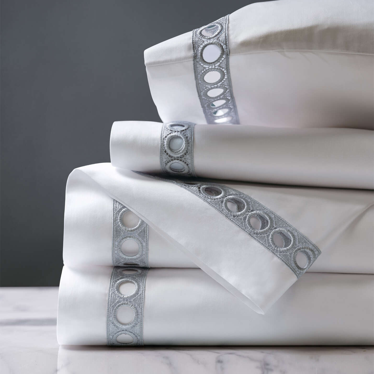 Boasting a meticulous attention to detail, Celine's delicate Guipure lace and luxurious sateen define luxury fine linens. Its intricate lace in subtle shades of champagne and silver elevates the crisp white Egyptian cotton for a modern, glamorous feel. This heirloom quality collection pairs beautifully with a variety of styles adding a touch of romance and elegance to any setting.