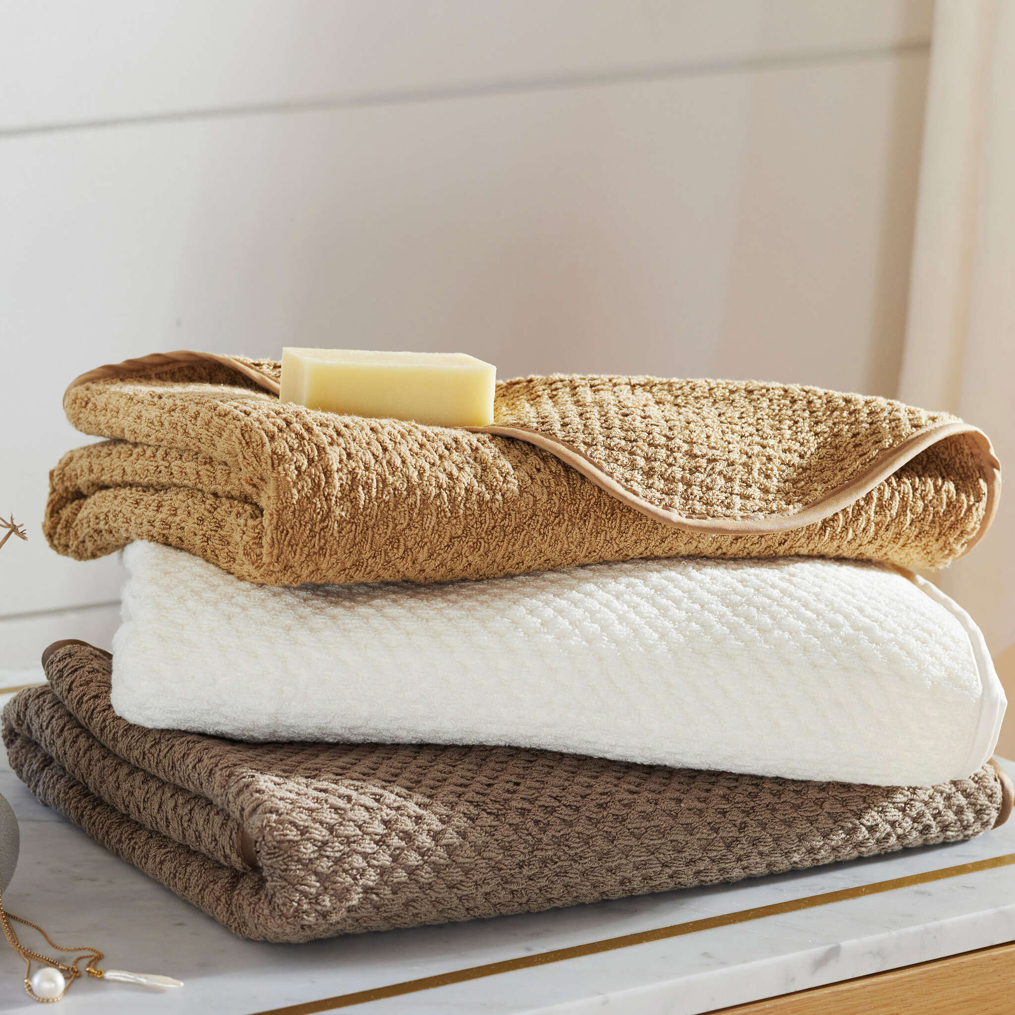 Our prewashed bath towels and robes combine the luxurious feel of cotton with the added strength of linen. Wrap yourself in casual elegance. This pronounced raised pattern provides a traditional and eye-catching statement to the bath.