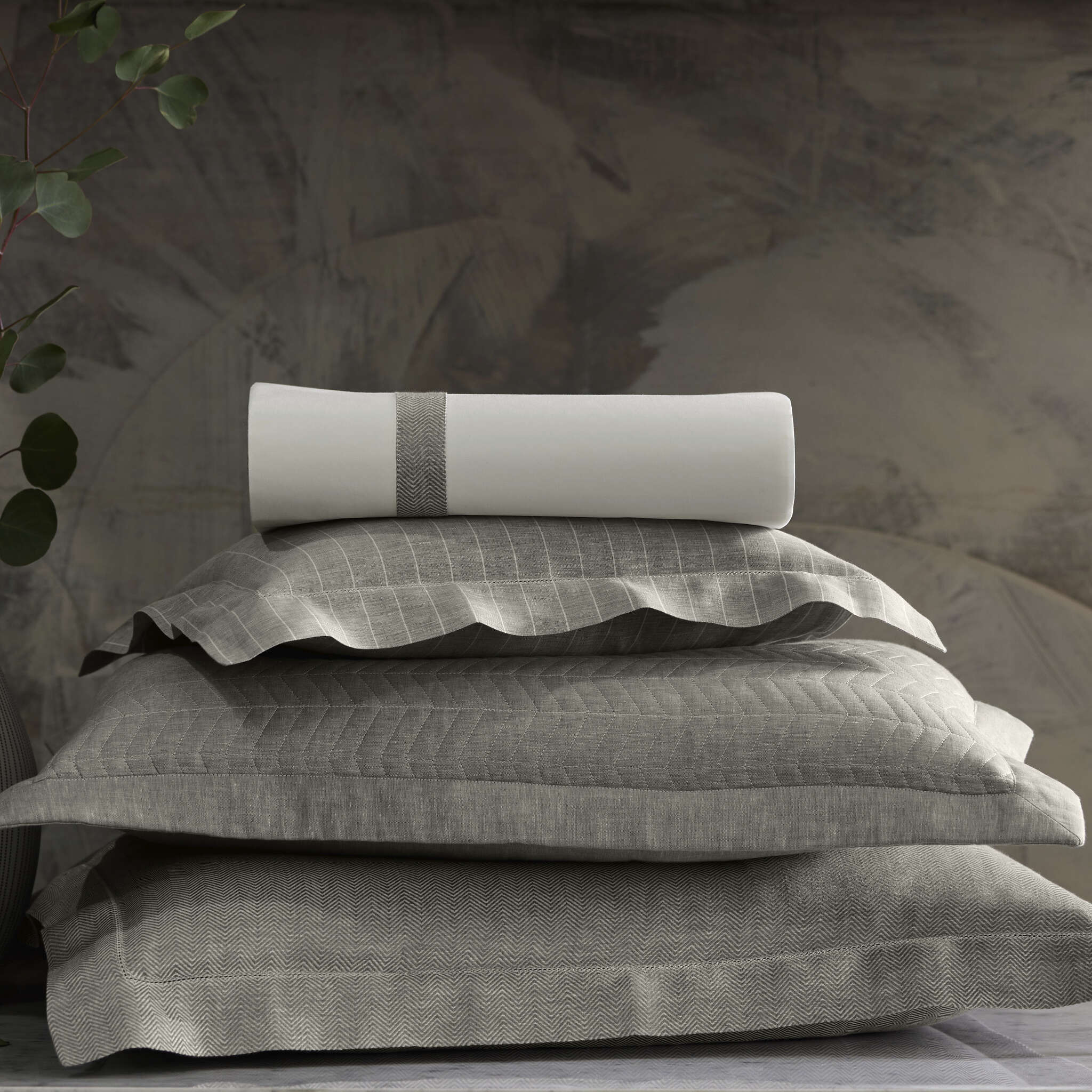 Three weaves of 100% Italian linen - Herringbone, Solid and Stripe - bring energy to this contemporary collection.