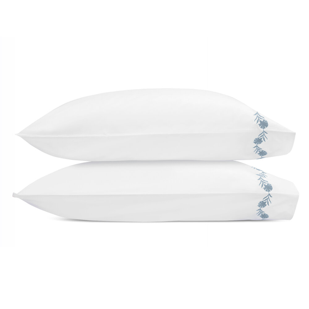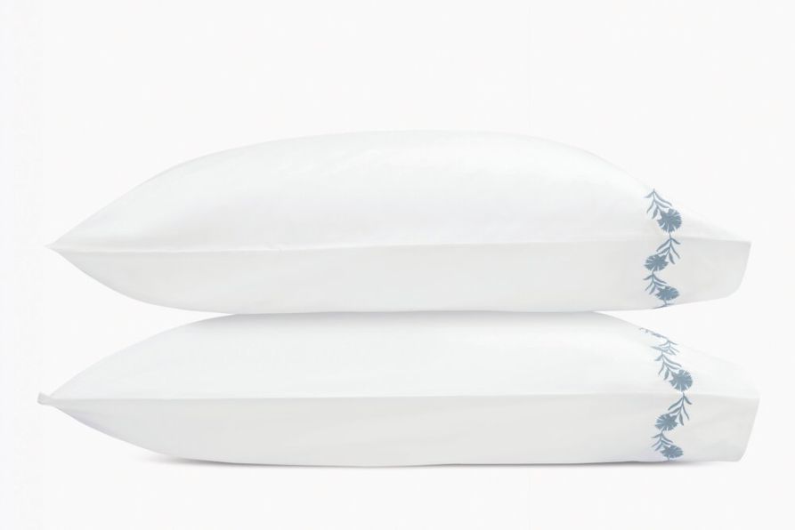 Daphne’s embroidered floral vine is a beautifully crafted detail that, depending on your choice of thread color, can be quietly classic or vibrant and bold. Made on white 520 thread count Ceylon percale, each piece is finished with a knife edge and delicate white cording.