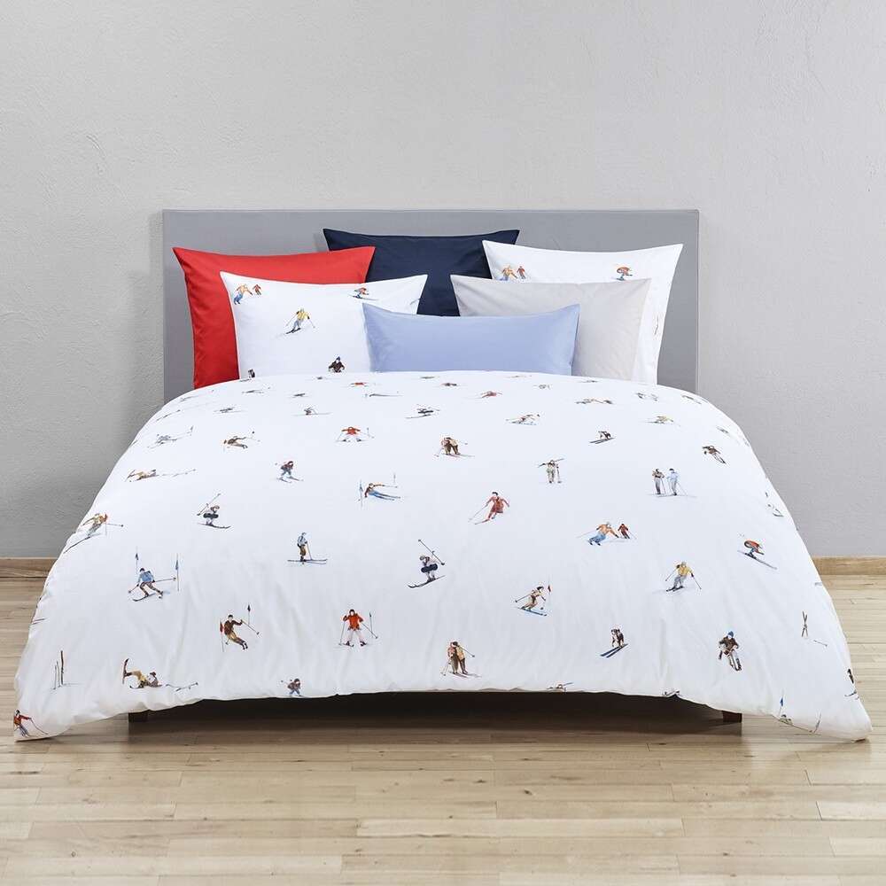With its ski theme, Engadina portrays a typically Swiss image. The bed linen features winter sports enthusiasts from the 1920s and 30s, alongside skiers of today, some whizzing down the slopes whilst others stand at the side and chat. The detailed drawing of the design, which was originally created using watercolour and photography, beckons the viewer onto the pistes of St. Moritz, the birthplace of the alpine sport at the heart of the Engadin valley. The dynamic motif’s meticulous engraving and brilliant colours are achieved through the intricate 12-stencil print carried out by our long-term Swiss partner.