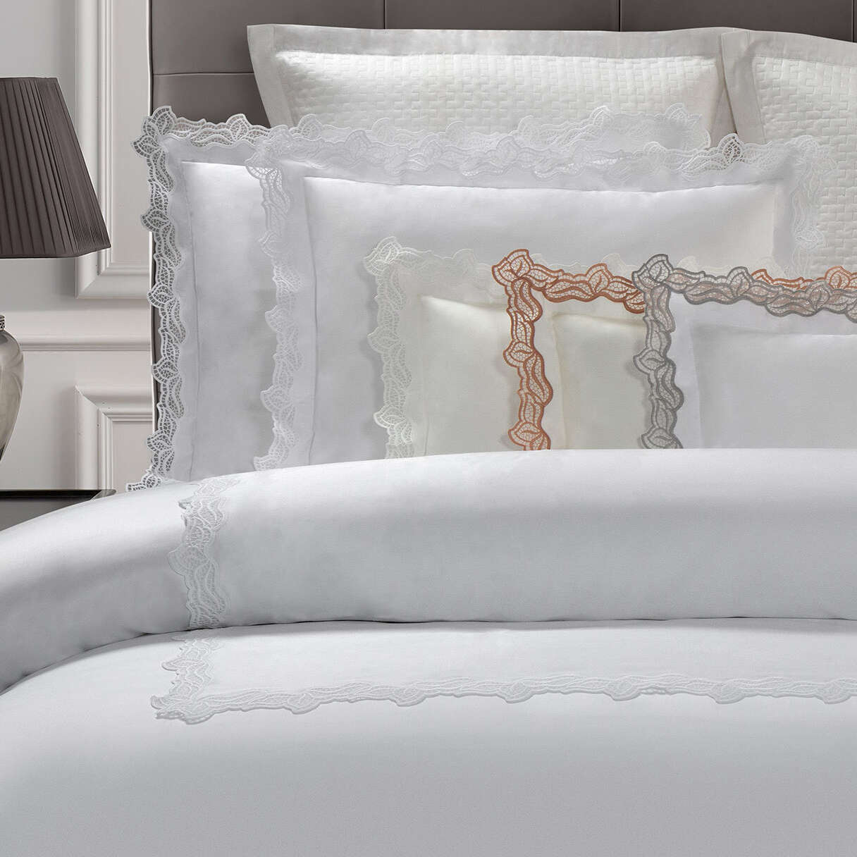 The Aura Collection comes exclusively in cotton sateen, a premium, tightly woven fabric with more threads in the warp to give it a particular aesthetic and luminosity. The absolute elegance of these fabrics is accompanied by snug comfort throughout the year and its excellent durability. Premium quality and an exclusive pattern distinguish the lace used in the Esther Lace Collection. The addition of the highest level of professional craftsmanship transforms every individual element into a masterpiece. Only a skilled artisan's superiority produces the perfection of stitches hidden in the lace design, complementing it without ever interrupting the visual harmony of the whole.