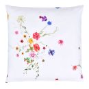 In a round dance with dahlias, zinnias and delicate cosmeae, deep blue cornflowers shine on bright white bed linen. Inspired by the playfully light room installations by Swiss artists Steiner/ Lenzlinger, the cheerful floral arrangements make us long for summer. The extra-long staple cotton forms the basis for the photographed and hand-painted flowers and tendrils.