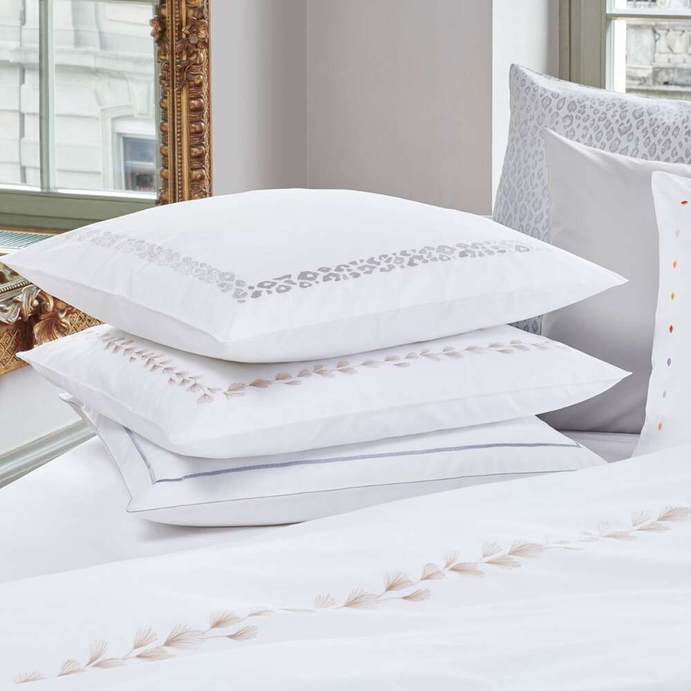 The delicate embellishments on our Foglia bed linen are a homage to classic embroidery and reminiscent of feathers. Two-tone rayon yarn in shades of gold and silver looks both exceptionally light and three-dimensional on our Swiss-Cotton satin. The graceful shapes subtly frame the pillowcase and wind their way across the duvet cover. The bed linen is hand-embroidered by our long-standing partner. Foglia is an enigmatic and versatile design which complements both classic elegance and urban minimalism.