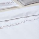 The delicate embellishments on our Foglia bed linen are a homage to classic embroidery and reminiscent of feathers. Two-tone rayon yarn in shades of gold and silver looks both exceptionally light and three-dimensional on our Swiss-Cotton satin. The graceful shapes subtly frame the pillowcase and wind their way across the duvet cover. The bed linen is hand-embroidered by our long-standing partner. Foglia is an enigmatic and versatile design which complements both classic elegance and urban minimalism.