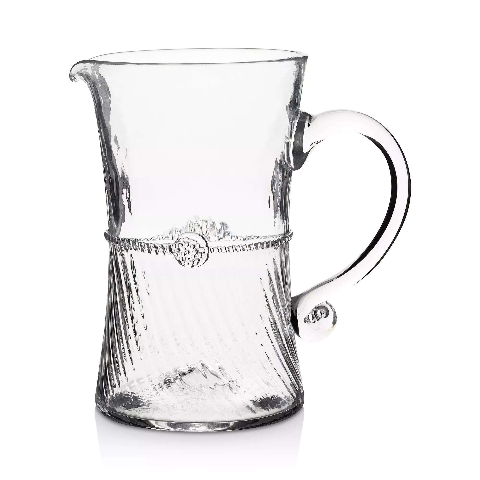 From our Graham Collection- Crowned with a simple thread and single berry, dressed in optic glass from the waist down and belted with a charming sash this large pitcher is a supreme vessel for iced tea, sparkling water or pink lemonade.
