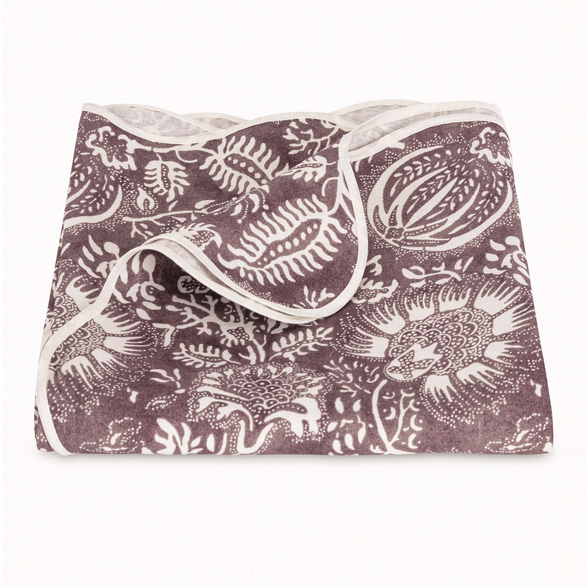 Hand-dyed textiles serve as inspiration for this intricate Schumacher botanical that places the symbolic pomegranate at its center. Perhaps history's most revered fruit, the pomegranate is believed to represent marriage, birth, prosperity, hope and abundance, adding meaning and merriment to these new table linens; finished with our scallop piped edge.
