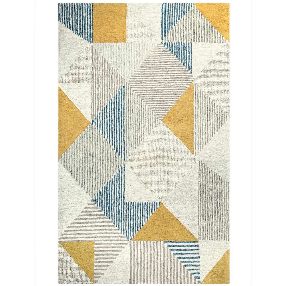 Abstract geometry lends the study of shape and space to our gracious design. Textural diamonds and triangles are rendered in multiple natural shades, complemented by mottled denim blue and sunny saffron yellow. Hand-tufted of 100% wool yarns in cut and loop pile.