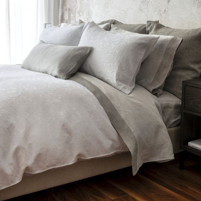 Discover the beauty of monochrome with Halo. A striking combination of minimalist energy with casual sophistication. Halo with its pure milky matte and sheen finish creates a monochromatic scheme delivering comfort and elegance. Expertly crafted with traditional European techniques, Halo combines fine Italian linen with the exquisite Giza Egyptian long staple cotton, delivering a transitional design.
