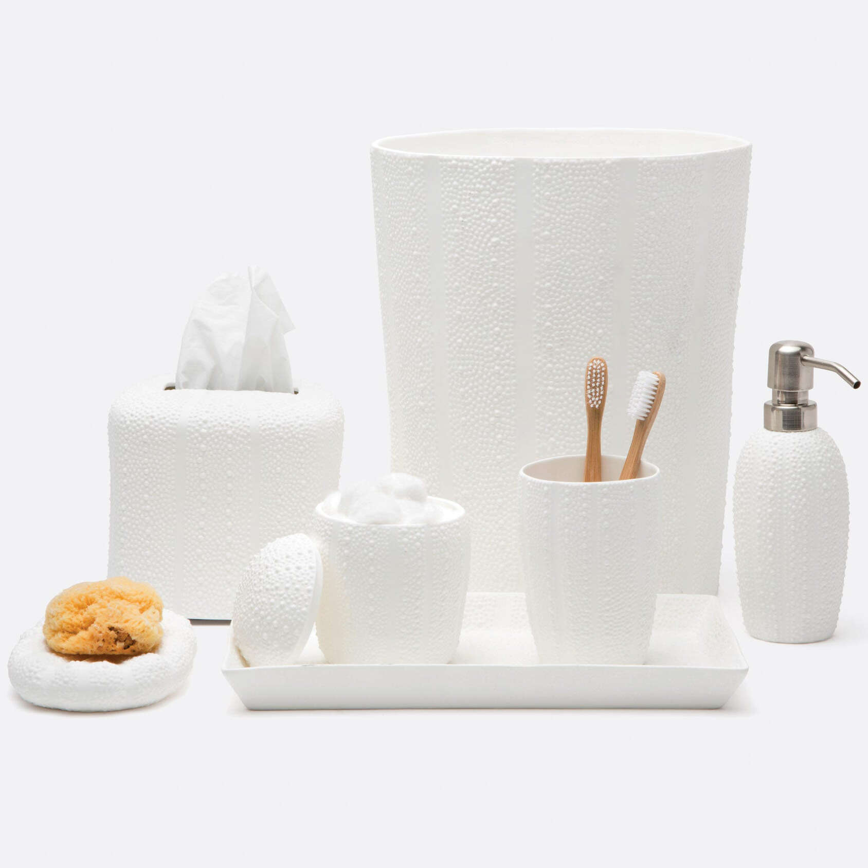 Our Hilo brings the beauty of the sea to your bath. Crisp, white porcelain adorned with a delicate sea urchin pattern provides a perfect combo of new and natural. The set's curved edges add a softness and the canister's lid resembles the unique sea creature itself.