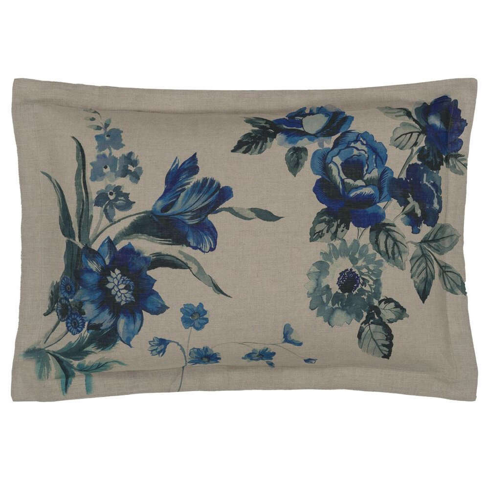 This stunning floral bedding print takes inspiration from the art of Hirigana painting - a celebration of nature with dramatic inky washed brush strokes in rich cobalt and indigo blue hues, digitally printed onto a luxurious 100% natural linen with a small scale inky floral on the reverse. Shams finished with a smart linen trim detail. This bedlinen will be sure to make stylish statement in your bedroom scheme and coordiates beautifully with our fabric, wallpaper and accessory ranges.