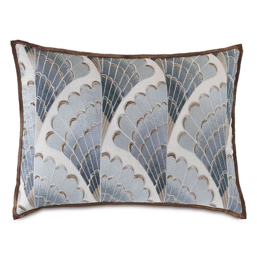 Standard, King Sham: Backed in a taupe, solid fabric. Gimp trim mitered flange on edge.