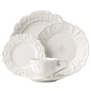 5pc Place Setting: Dinner-9.5"L, 9.5"W, 1"H; Salad-9.5"L, 9.5"W, 1"H; Cocktail-7"L, 7"W, 1"H; Teacup-6.25"L, 4.25"W, 3.25"H; Saucer-6.5"L, 6.5"W, 1"H. Cup -11 oz.