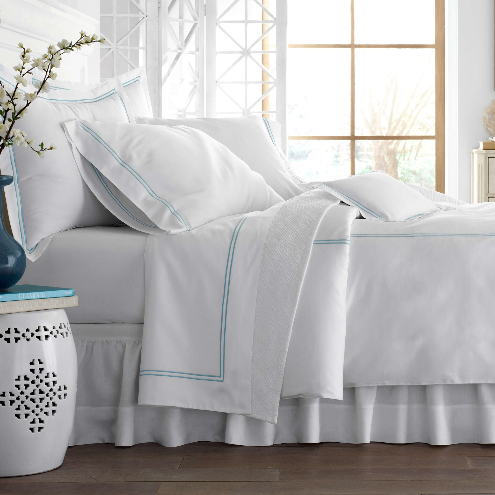 Kelsey hotel style sheeting features two lines of embroidery in your choice of color on our cotton base sheet. Base sheeting offered in White, Ivory or Eggshell in Sateen or Percale.