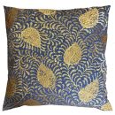 Kinrande is inspired by a Ming-era cobalt blue and gold pot in the Met’s collection. The gold and bronze motif is embroidered onto a marine blue linen/cotton ground.