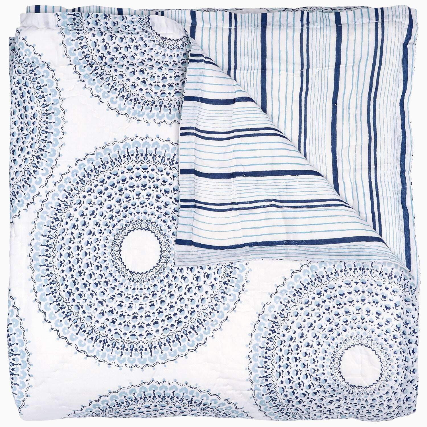 Our best selling Lapis print is based on a vintage woodblock we originally used for carpets. The large scale makes printing a challenge, but well worth the effort. Circles of light and dark indigo mesmerize the eye like a hypnotic wheel. The pattern's handcrafted look paired with soft-as-a-cloud cotton voile lends a dreamy quality-a nice complement to the modern design. Easy-to-layer hues complete the look and a pure cotton fill creates a beautiful drape. All quilts are reversible.