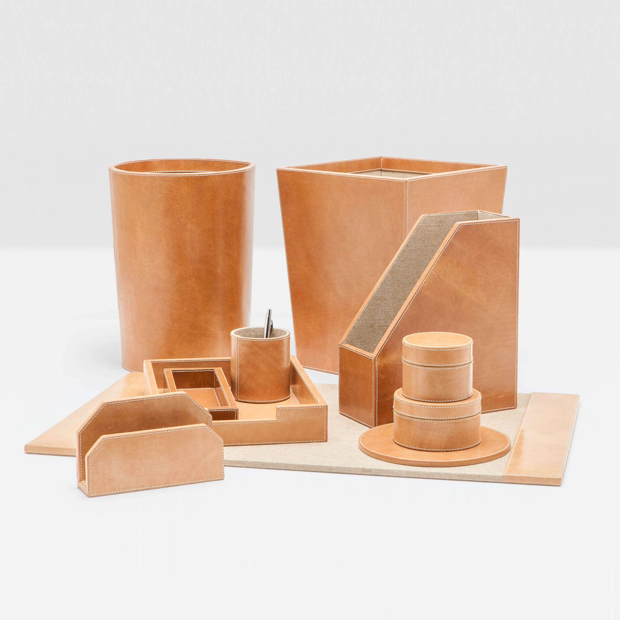 A stately space deserves the refined accessories of our caramel leather Leon collection. Complementary ivory stitching adds a finished flair.