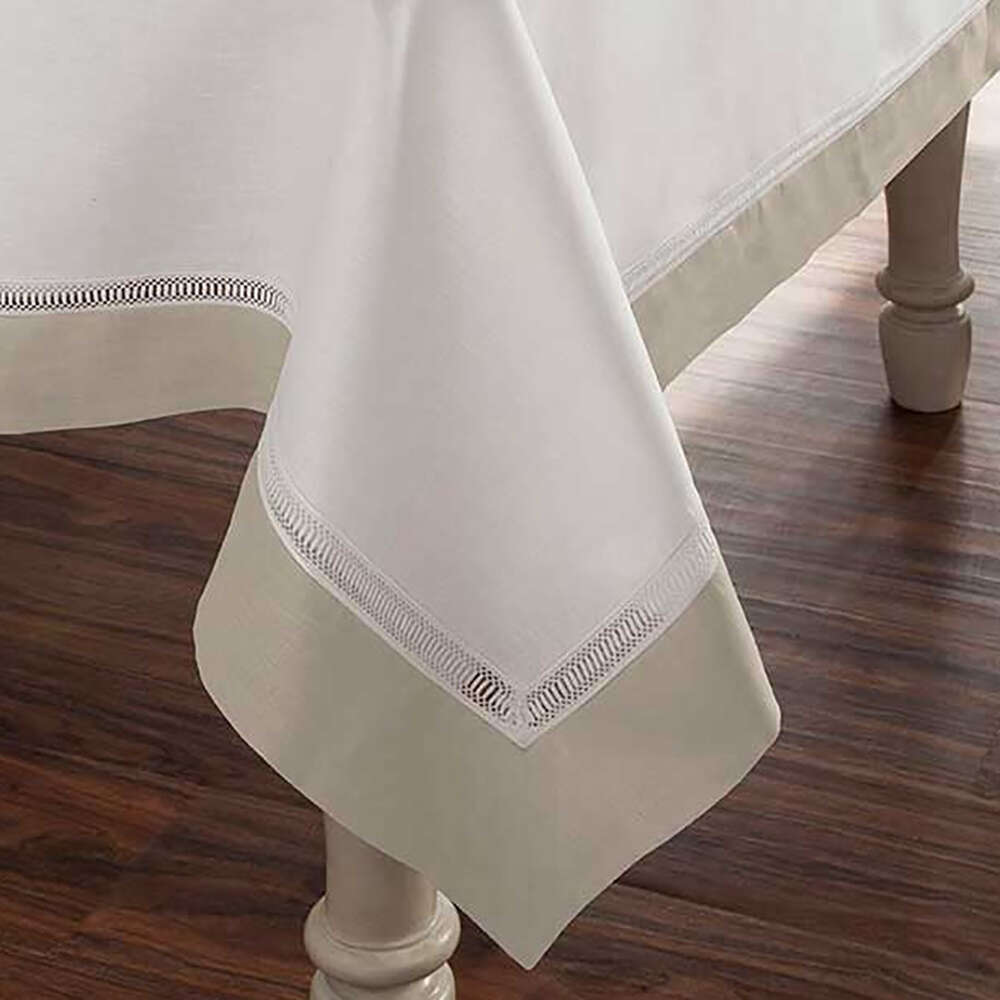 Linea Tablecloths, Linea Dinner, Linea Placemats: are designed with a contrasting linen border and our classic Doric lace inset.