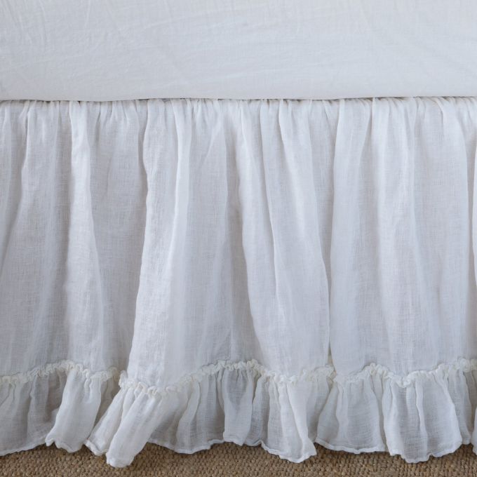 Bed Skirt: Gathered linen whisper with 5" ruffle, adjustable 22" drop, 3 panels.