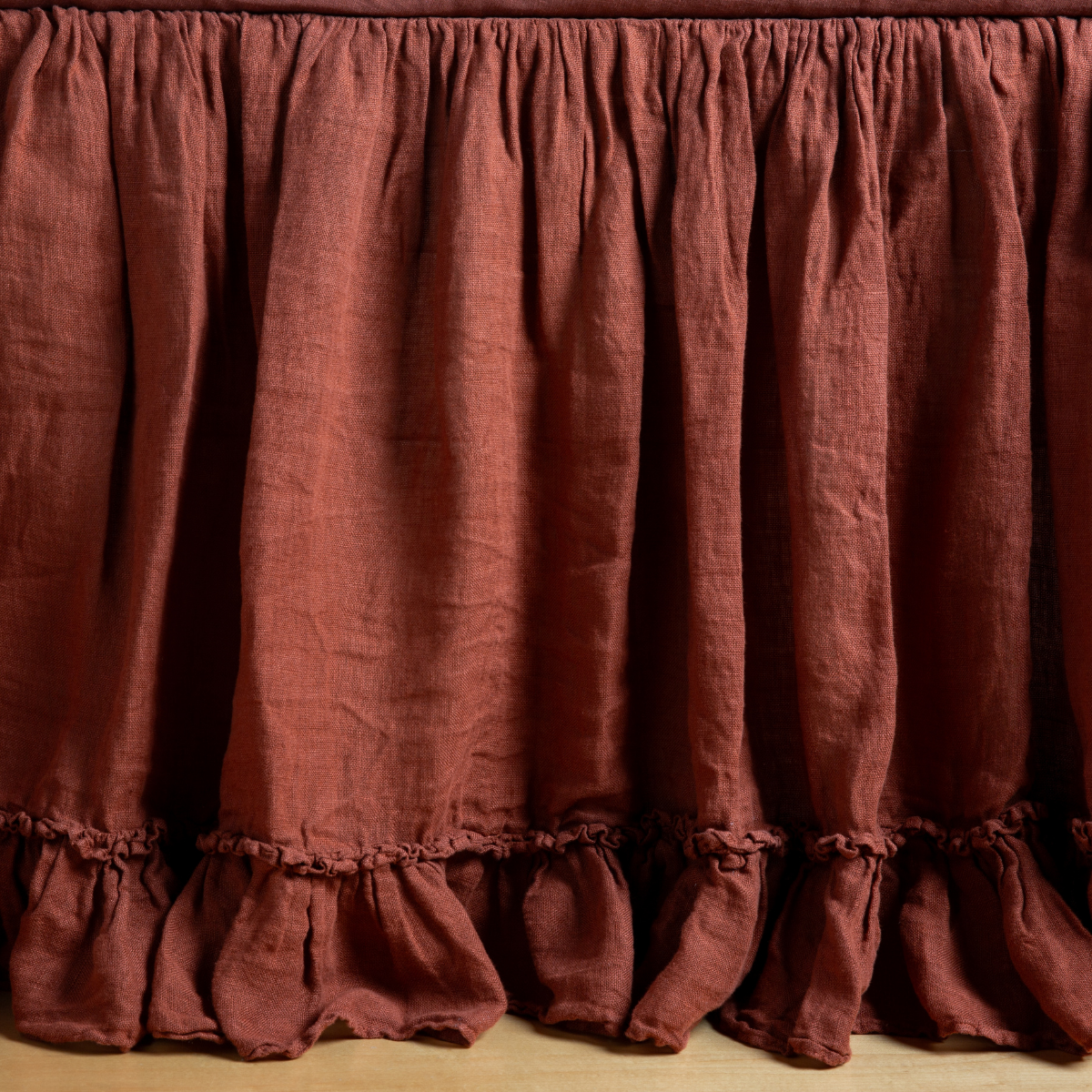 Gathered linen whisper with 5" ruffle, 16" drop.