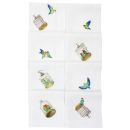 There are eight linen napkins each with a different corner motif. Settled lovebirds snuggling in bamboo cages or flighty birds in search of love.