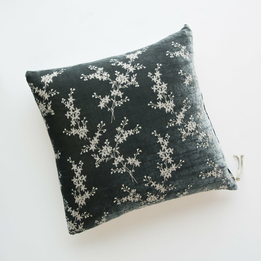 Designed in softly textured silk velvet, our Lynette Throw Pillows flaunt graceful floral embroidery with pale gold accents inspired by vintage chinoiserie. Available in five sizes and two styles, layer our Lynette pillows into your space for a luscious pop of old-world glamour blended with modern form. All reversible, the 18x18 and 16x36 are backed in the same fabric as its front, and the 15x24 and 24x24 styles are backed in midweight linen. The 9x39 bolster pillow has a modesty panel of Tencel™ a nod to our Lynette Luxe collection.