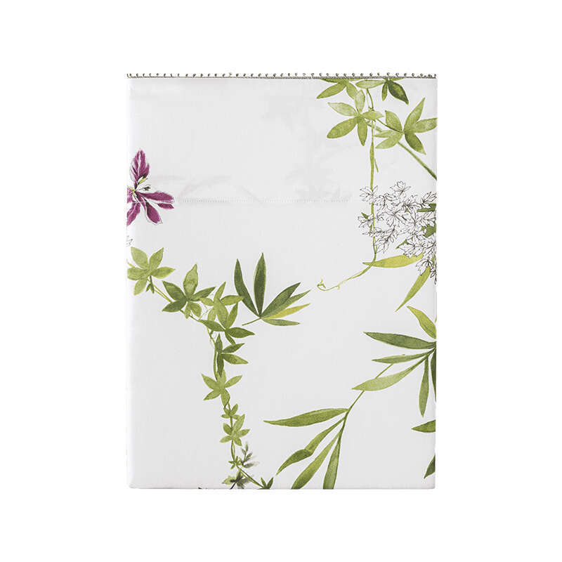 Flat Sheet: "Vines & orchids" printed body, picot ribbon piping at the top edge.
