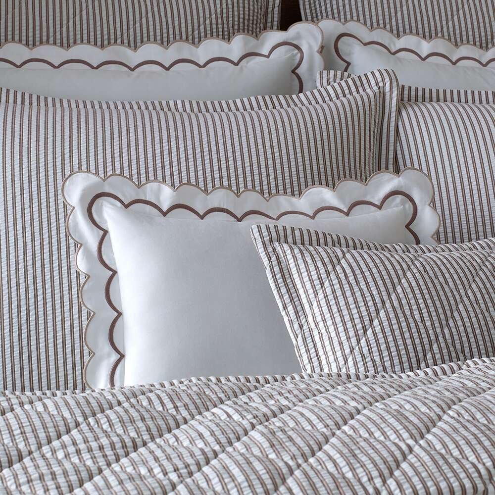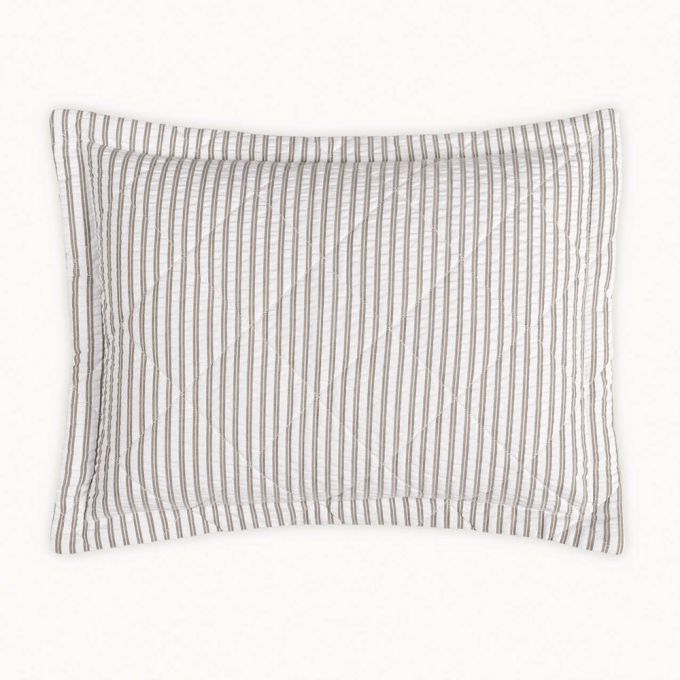 Matteo provides sophisticated top-of-bed options that evoke elegant menswear fabrics. Our interpretation is sharp seersucker with a two-toned stripe and finished with a 1-inch flange. You'll love its dapper look as a duvet, shams, and a quilt with a 4-inch diamond stitch pattern.