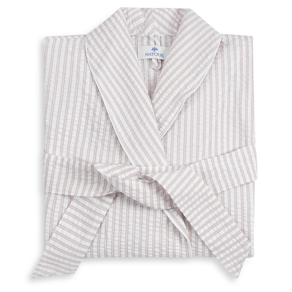 Our Matteo robe of striped seersucker is cool and comfortable,and more than a little elegant. Made in the USA of fabric from Portugal. 100% Cotton