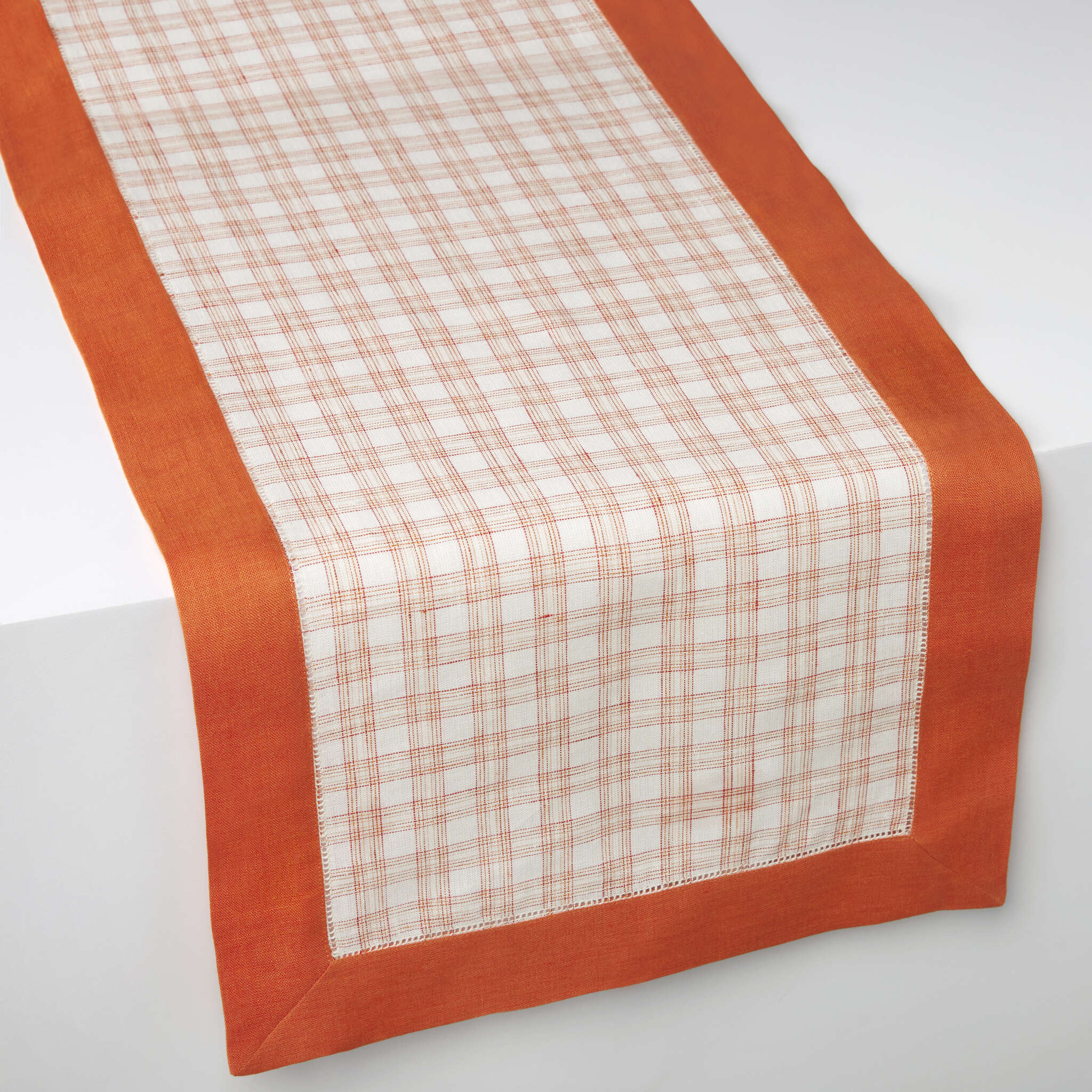 Evoke the spirit of a garden picnic with the Mikela table collection, crafted from 100% linen in a colorway of tangerine, fern, and navy — bright and fresh, reminiscent of bountiful florals in full bloom. A yarn-dyed jacquard weave creates a pattern of large plaid squares framed by a bold contrast border with an impeccable hemstitch finish, Mikela is designed to complement our Mikelina collection for a perfectly coordinated look.