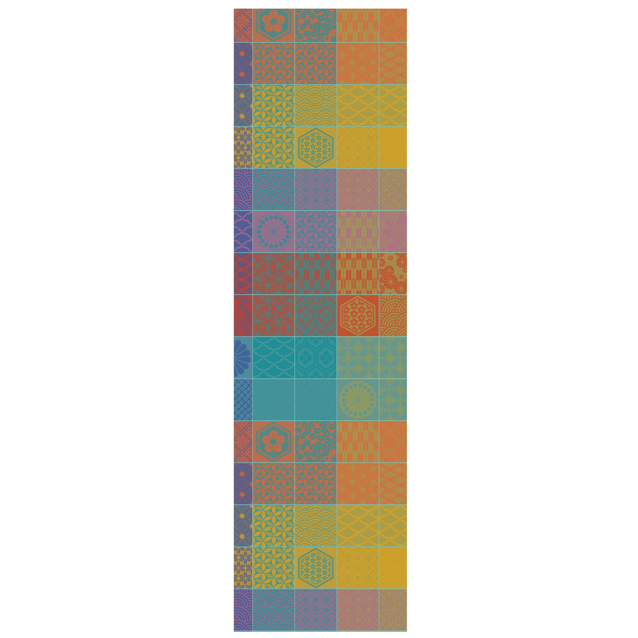 The Mille Hana Floralies Tablecloth is woven in France from 100% extra-long staple cotton, featuring a richly detailed jacquard weave that offers a soft, elegant finish. Its multicolored floral tile pattern in in colors such as orange, red, blue, and purple is expertly crafted, with each thread layered to create depth, harmony, and visual movement. A celebration of color and craftsmanship, this design brings refined artistry to the table.
