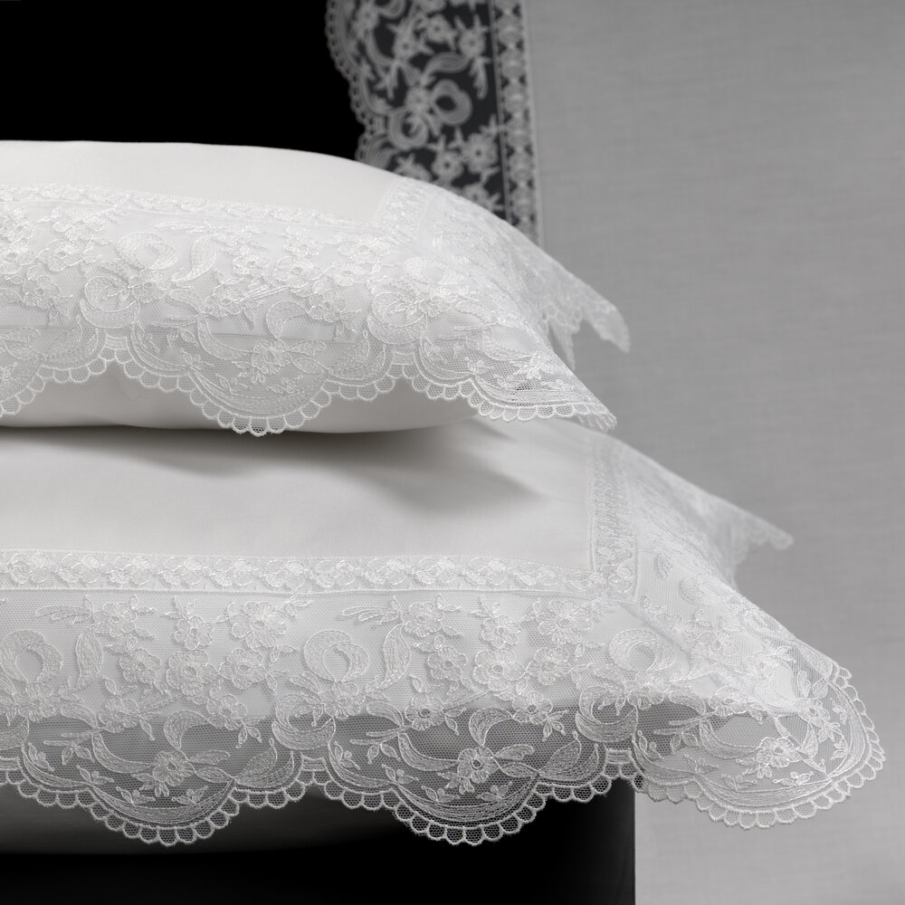 Duvet Cover: Knife-edge and hidden-button closure; U-shaped lace on top of the bed.