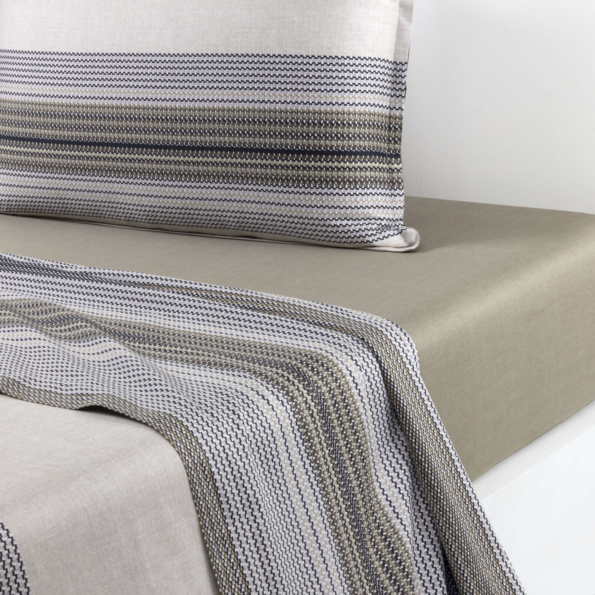 Inspired by the modernist movement of the early 20th century, this design embraces simplicity: a repetitive geometric pattern of lines, mineral tones, and subtle anthracite accents. On the reverse, a khaki hue adds depth with a textured effect. The sateen is crafted from high-quality cotton. Lustrous and radiant, sateen is highly valued at BOSS for its softness, silky appearance, and suppleness.
