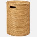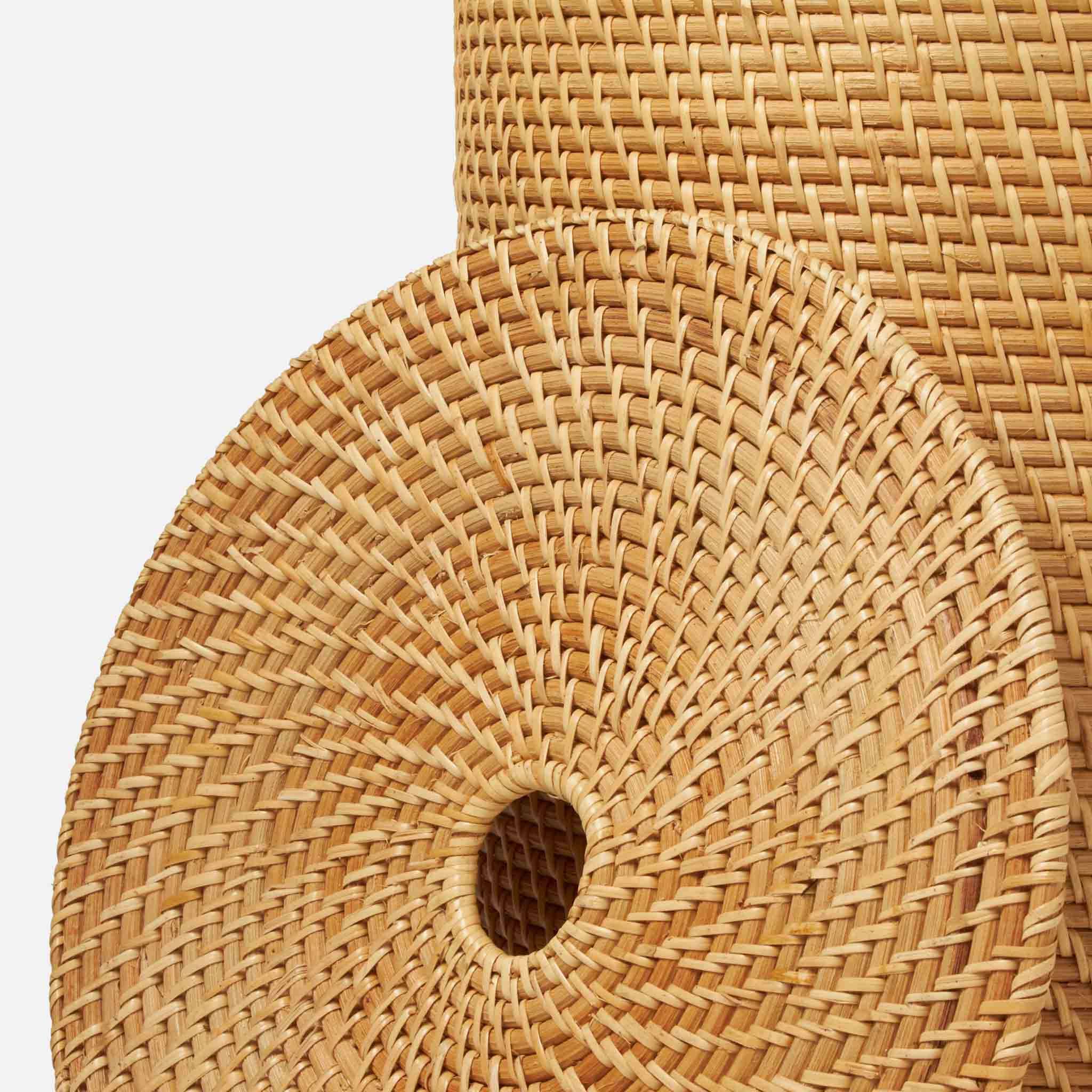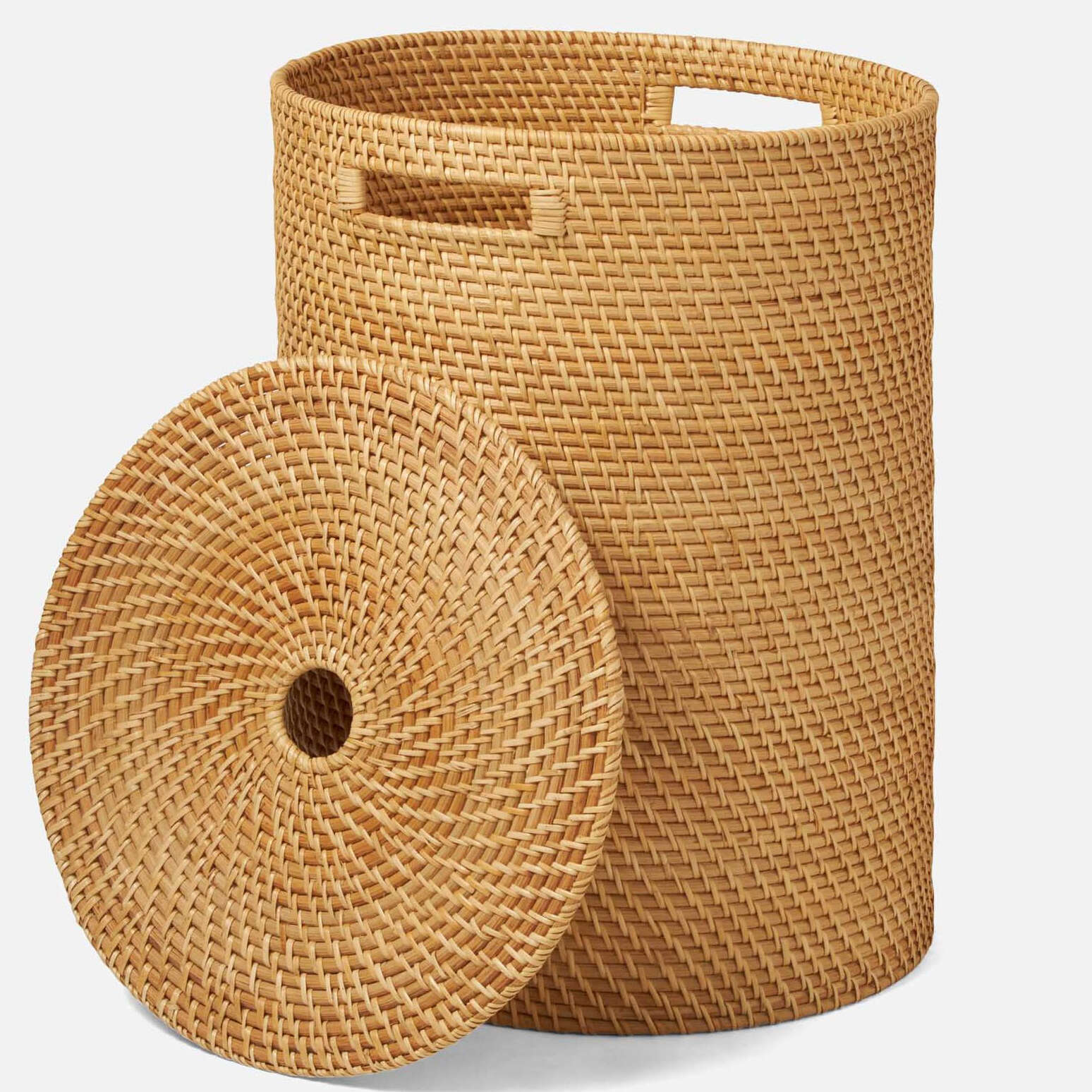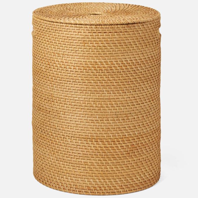 Our Nema hamper, hand-woven from neutral, natural rattan, features comfortable handles and a convenient detachable lid.