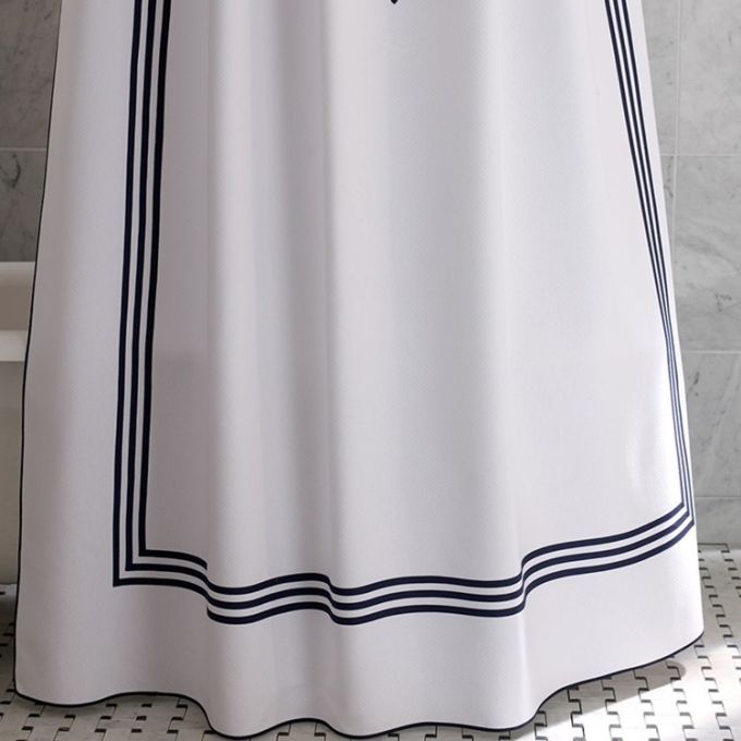 Three bold lines of applique trim make a bold accent on this light pique shower curtain. The fabric is an easy-care blend of 70% cotton, 30% polyester. All Shower curtains are 72"x72". These shower curtains can be custom made in 60 colors from the Matouk tape chart. Please choose color of Pique fabric along with the tape color you would like. Monograms are done in Applique to match the trim color you choose. No Returns or exchanges. 5-6 week lead time.