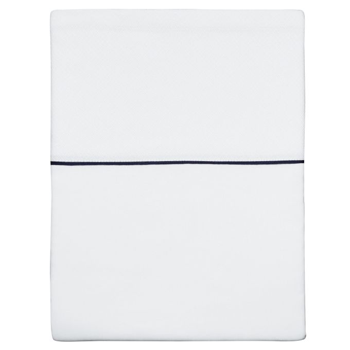 The combination of an ultra soft and silky snow satin and a micro pattern with a guilloche effect, woven on a jacquard loom, gives a pleasant play of texture, for a simple and effective product. The seduction of this classic style comes from the contrast of materials (the texture of the jacquard and the silkiness of the satin), the contrast between the colour of the ribbon and the purity of the white linen. The simple and careful manufacture of the duvet covers and pillowcases gives the advantage to the jacquard, while the back is in white satin.