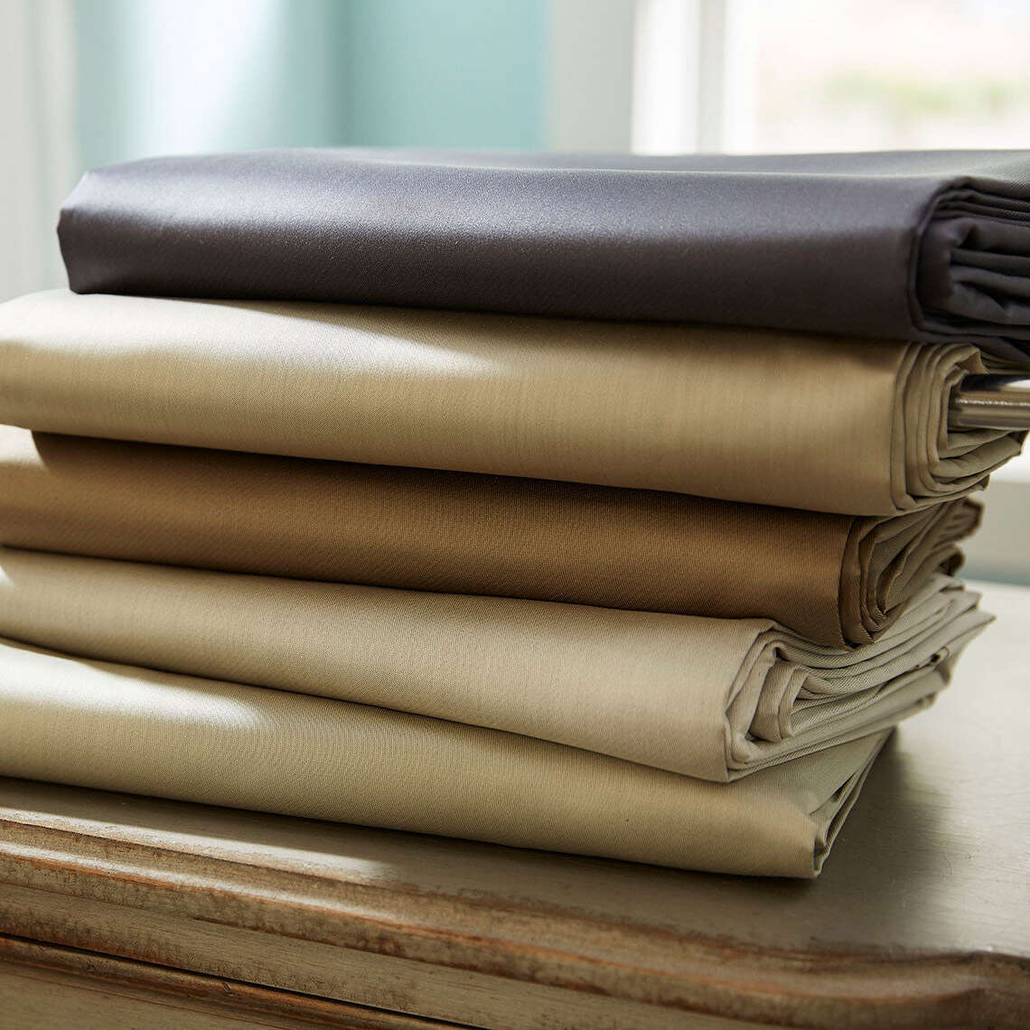 These solid duvet covers are of a yarn dyed sateen weave, 565 thread count. Available in two fabulous colors, taupe and pearl. Wonderfully finished the top sheets are hemmed on four sides with mitered corners and generous turn back. The fitted sheets have two available pocket sizes each with an extra 3" to tuck under, and elastic all around. Pillow cases have a button closure. Pillow shams are flanged, with a back envelope button closure. 100% Egyptian Cotton. Yarn dyed sateen weave. 565 Threads per square inch. Color: Golden Aqua, Oregano, Pearl, Tea.