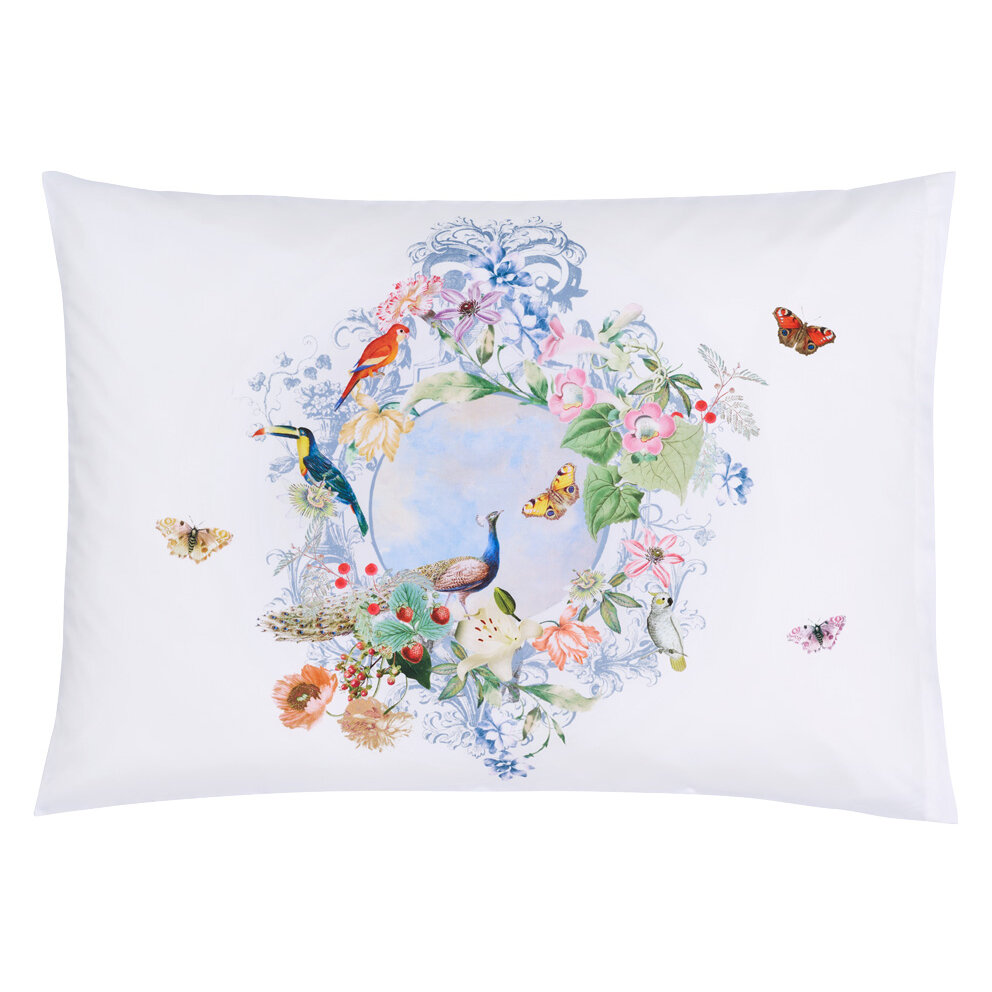 PEACOCK is a tribute to the French «Toiles de Jouy». The distinctive printed fabrics were originally produced with engraved copper plates and created detailed, figurative or floral images. The protagonist of this contemporary interpretation is the peacock, surrounded by fine medallions, architectural elements and exotic plants. Delicate landscapes with elegant flower garlands in shades of blue adorn the white background. The double-sided fabric with an elegant, shiny plain satin on the reverse and matching cushion motifs offers special design options for sophisticated sleep culture.