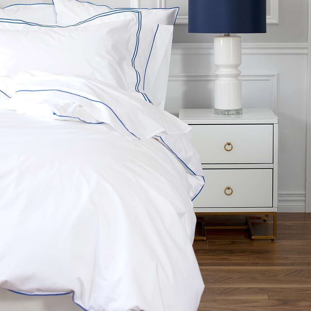 Our crisp, white percale is woven with the finest long-staple cotton and elevatedwith a contemporary and elegant purl stitch edge detail. Customize your look and create the perfect accent for your space by choosing your own edge trim colour. Single shams are extra special with a double open flange and purl stitch. Flat sheets and pillowcases feature a generous 3” cuff with purl stitch.
