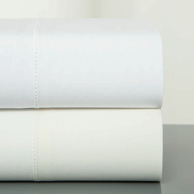 Flat Sheets and Pillow Cases: Solid polycotton body, with a tone-on tone, hand-guided hemstitch on the cuff hem.