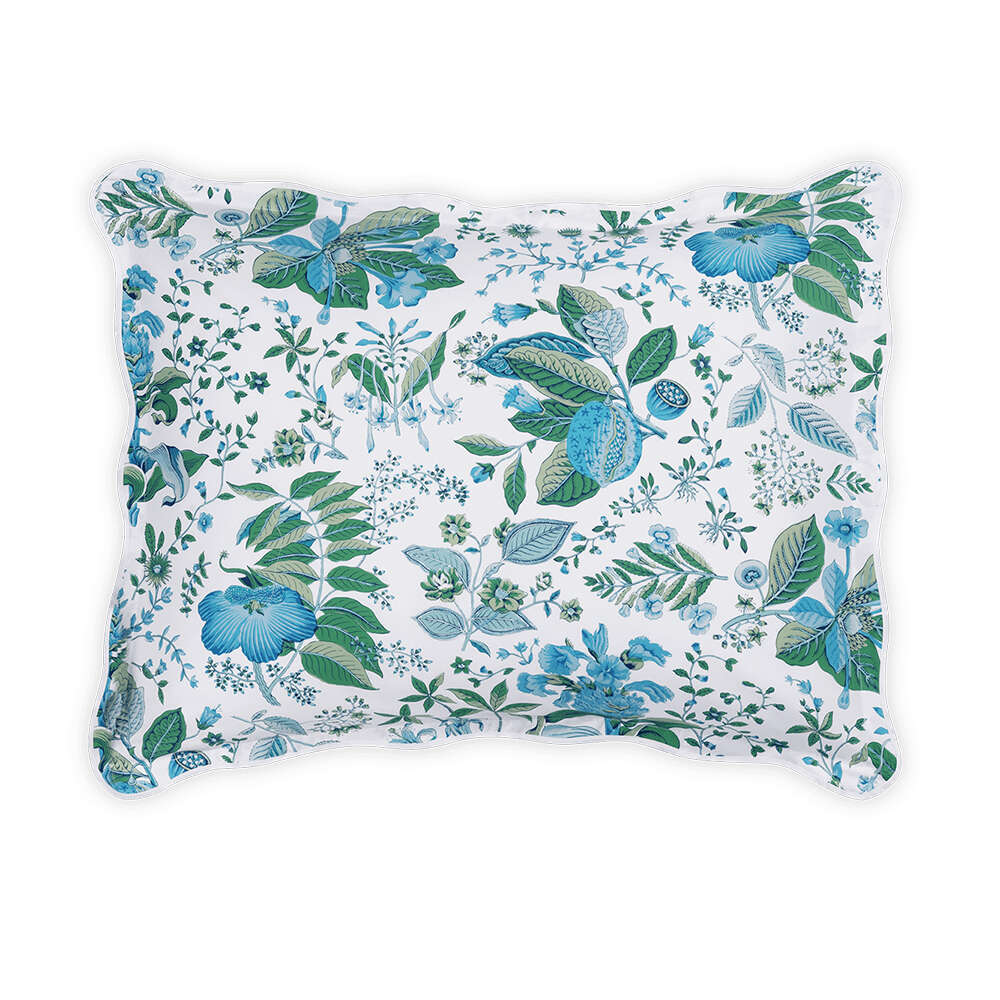Based on an 18th century design from Schumacher’s archive, Pomegranate reimagines a timeless botanical in four luscious colorways. This vibrant style is printed in Italy on our 500 thread count Luca Egyptian cotton percale and finished with the subtlest scalloped edge and white tape—a perfect pairing of Schumacher artistry and Matouk craftsmanship.