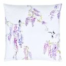 From rose to pink, purple and blue, the blossoms of the Japanese blue rain cover the blankets and cushions of the PURPLE RAIN creation like a fine mist. In between, the chirping of young swallows can be heard, perched on fine branches or soaring high in the air. The motifs were skilfully watercoloured in the Christian Fischbacher studio and printed on the fabric in our print shop in Italy with great attention to detail. printed with great attention to detail.