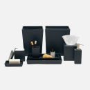 Sleek and masculine, the Quincy bath collection makes a strong impression in matte navy lacquered wood.